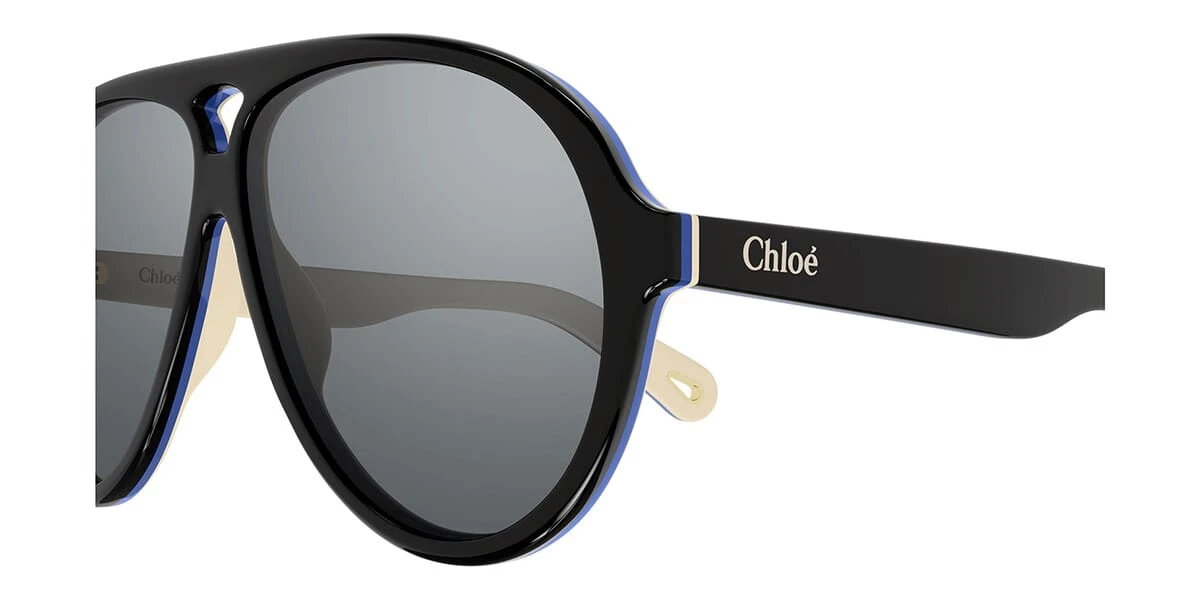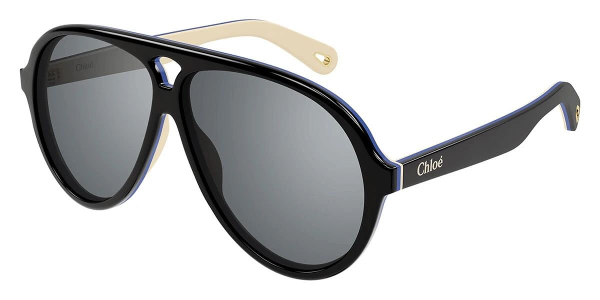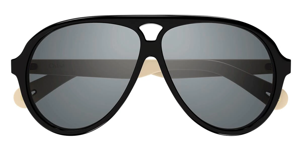 This aviator Chloe sunglass comes in a black with cream frame with grey with light silver mirror lenses.