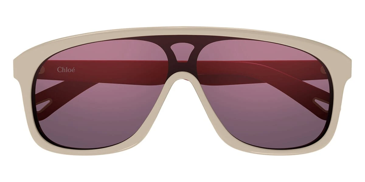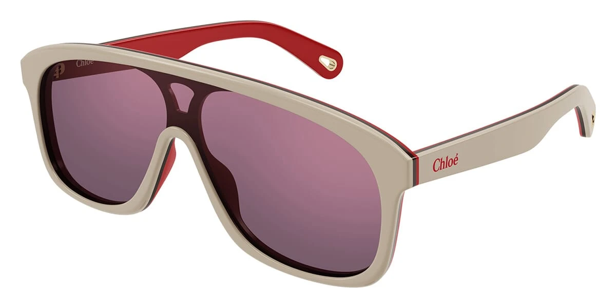 This shield Chloe sunglass comes in a ivory with red frame with pink with light silver mirror lenses.