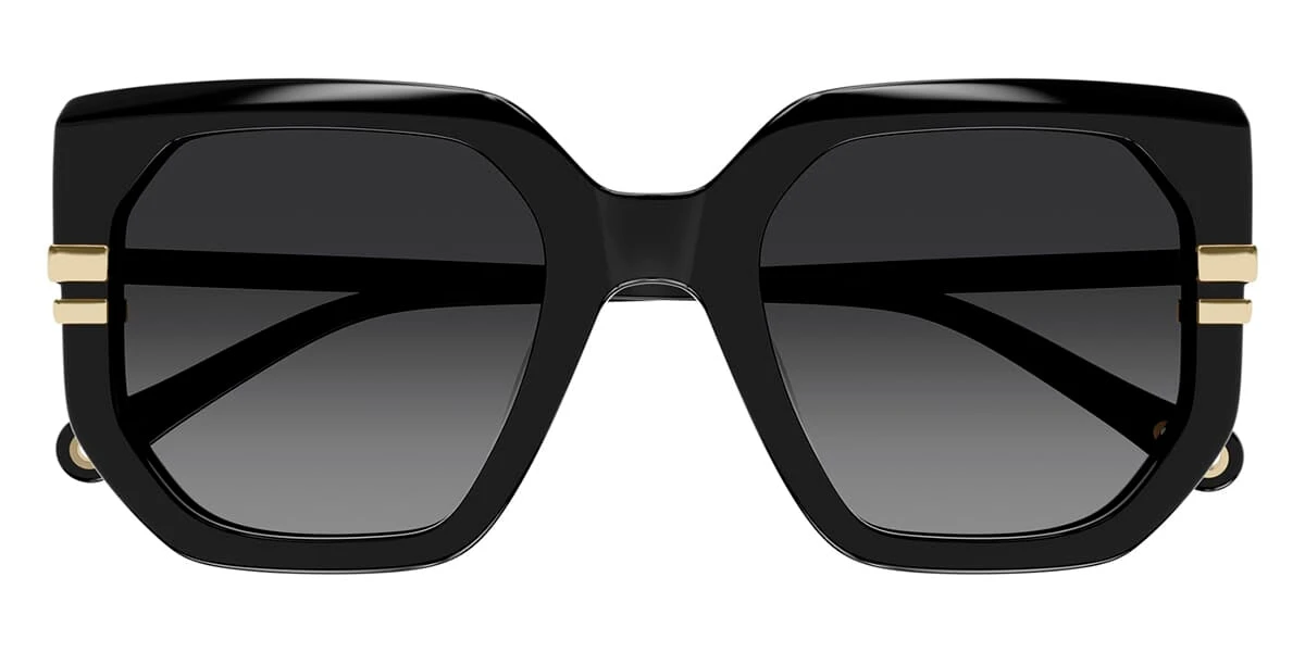 This square Chloe sunglass comes in a black with gold frame with grey lenses.