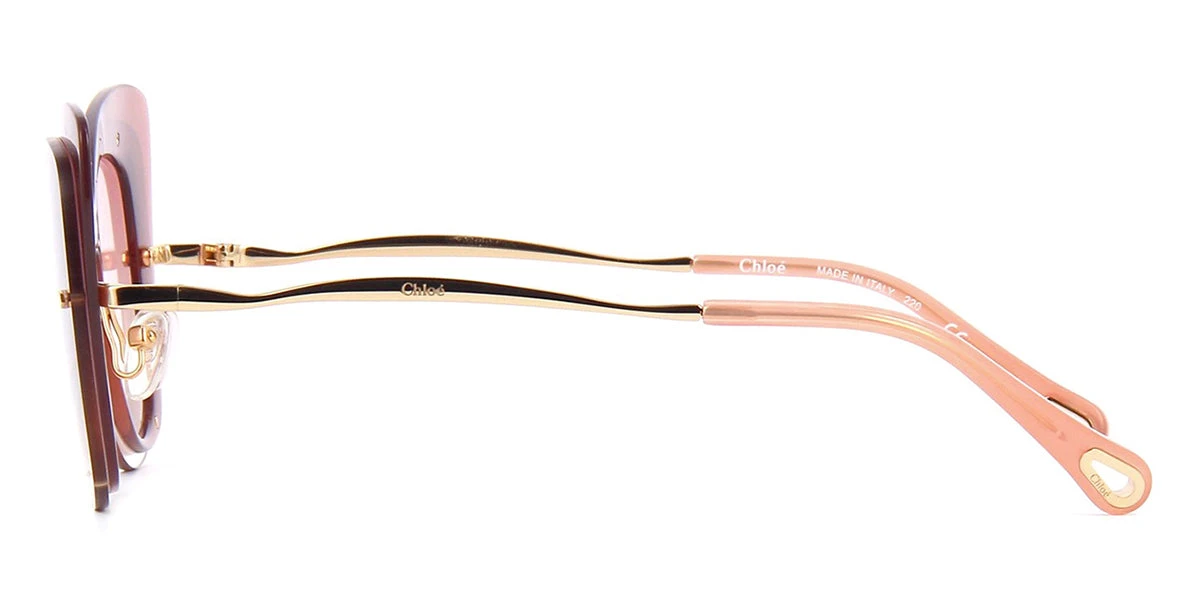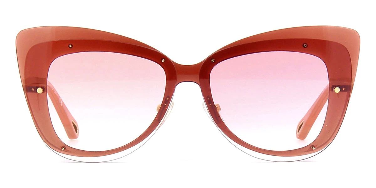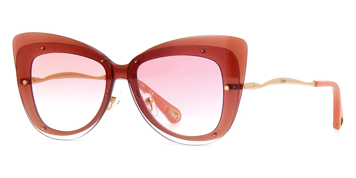 This cat eye Chloe sunglass comes in a peach crystal and gold frame with pink gradient lenses.