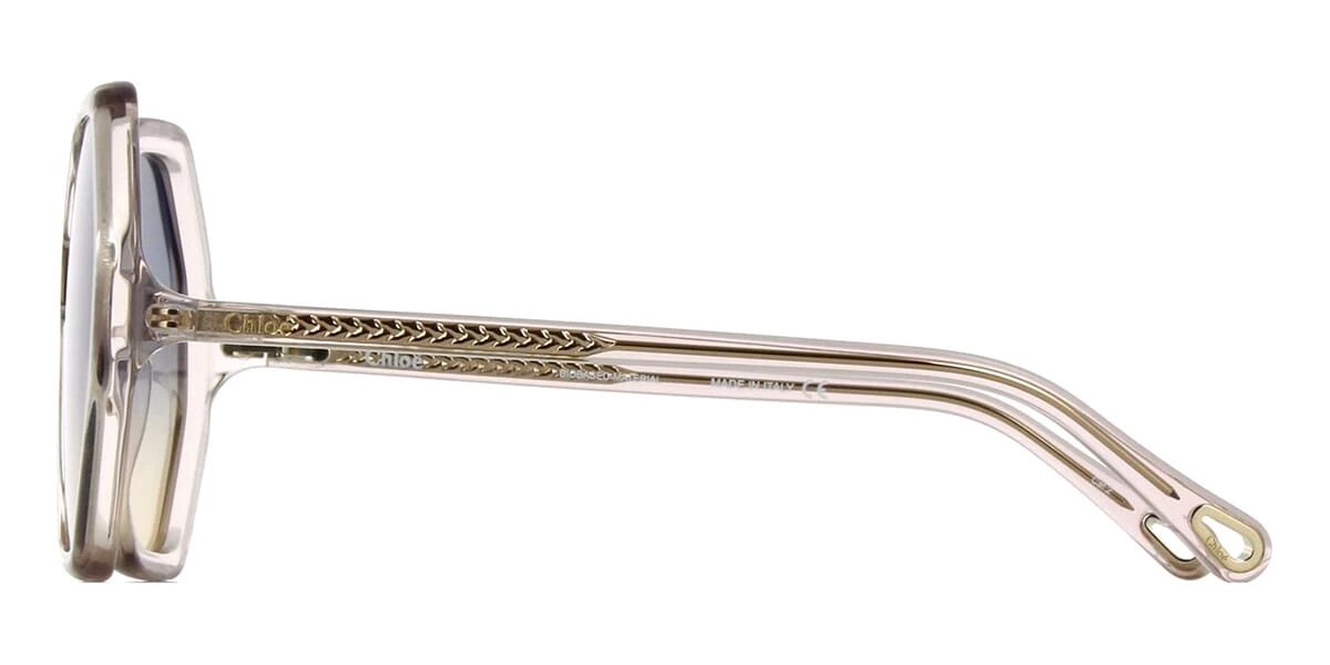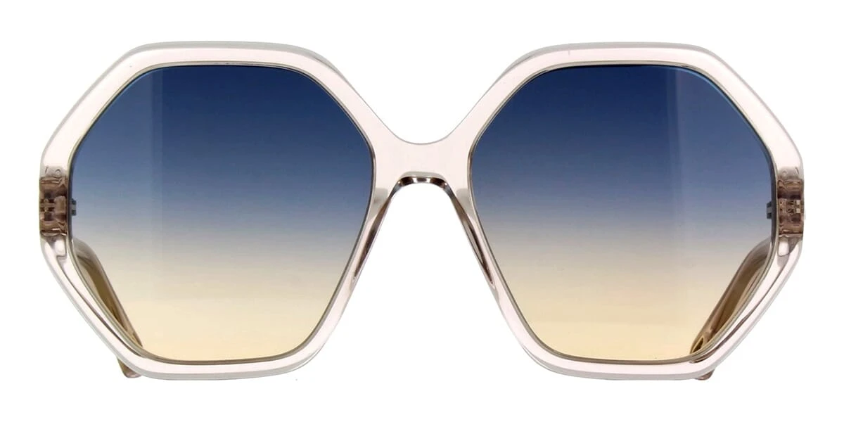 This round Chloe sunglass comes in a pink crystal frame with blue to peach gradient lenses.