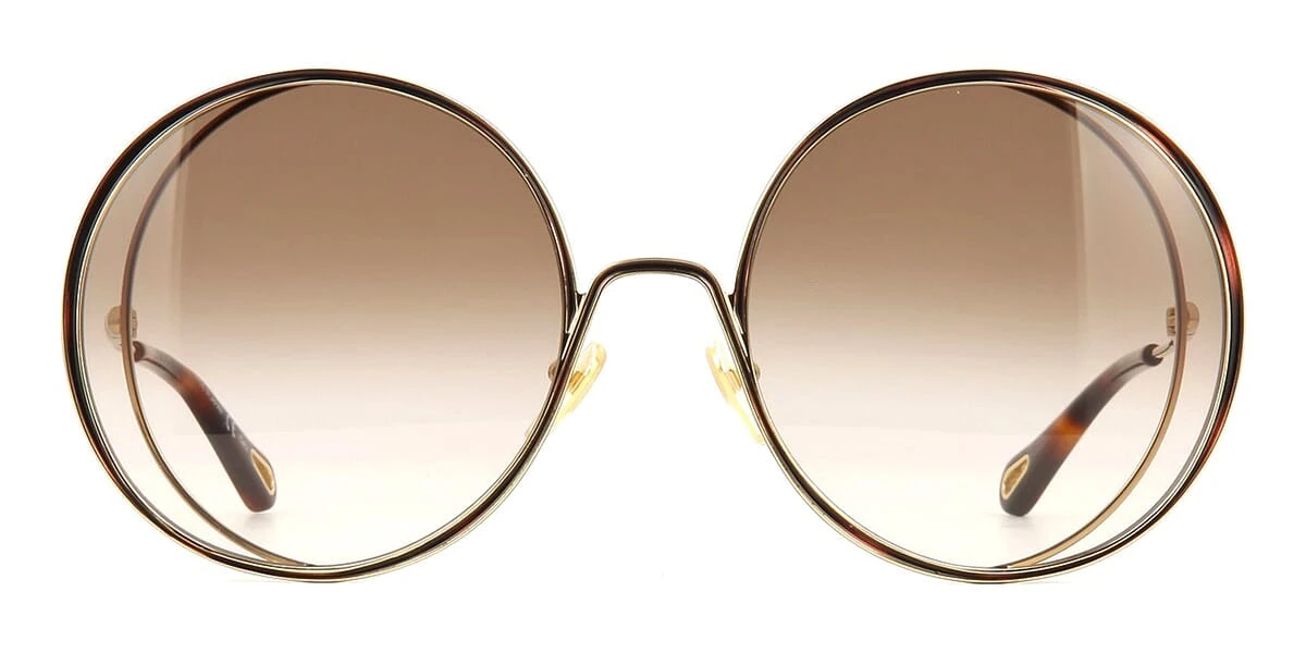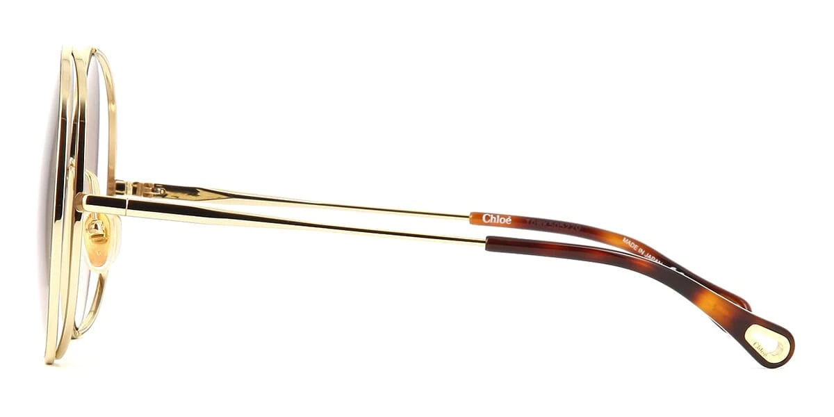 Round gold frames, introduced in Chloe’s Spring/Summer 2021 collection. These are part of the Hanah collection, a new evolution of the brand’s iconic Carlina line. Frames from the Hanah collection feature oversized metal styles with an internal rim profile, re-imagining and re-creating the classic Carlina double frame look. Brown gradient lenses are accentuated by sophisticated havana enamel embellishment on the front of the frame, creating a modern-retro aesthetic. The classically elegant Chloe logo is featured as an understated laser etching on the left temple, while both temple tips feature the signature teardrop cutout, providing both aesthetic appeal, and the option to attach Chloe eyewear jewellery.