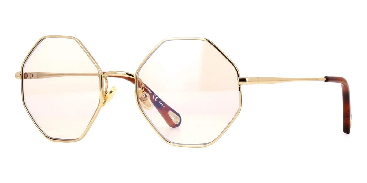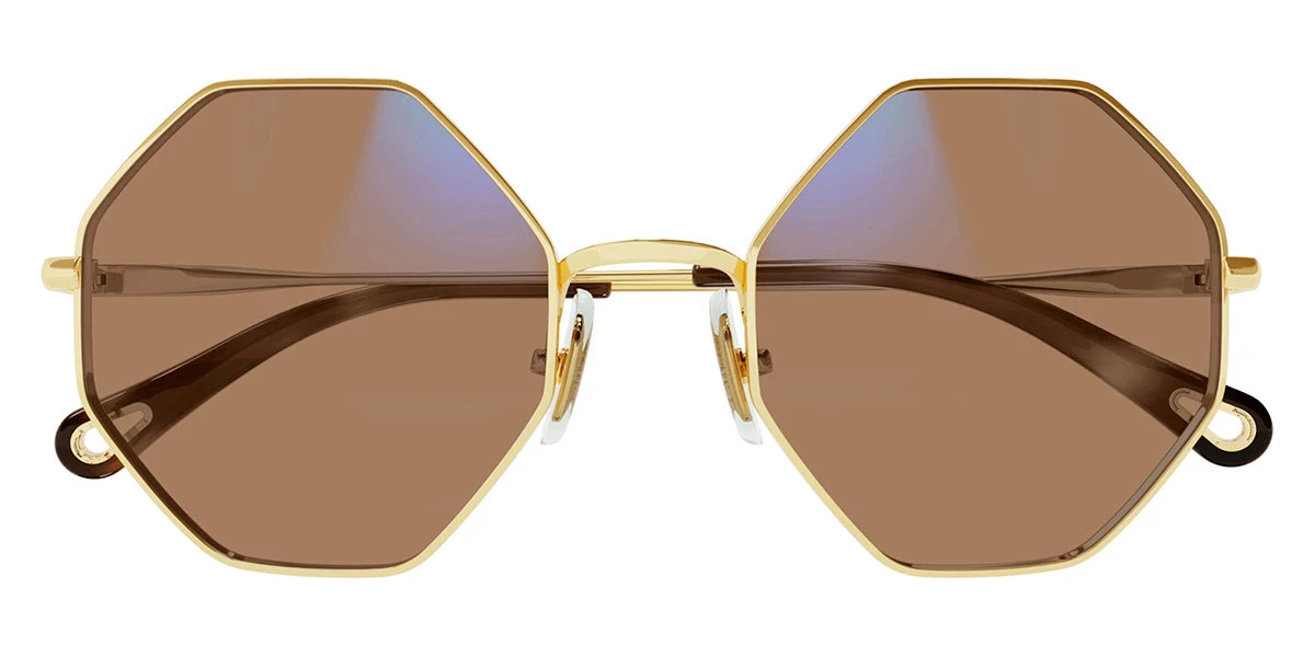 This round Chloe sunglass comes in a gold frame with blue control photochromic lenses.