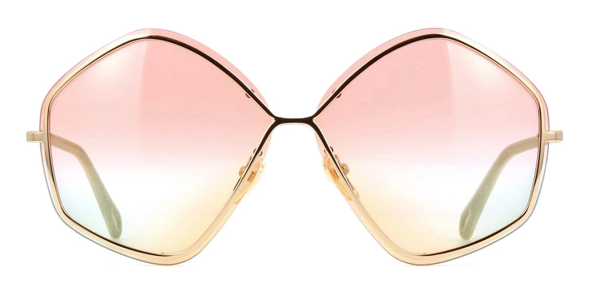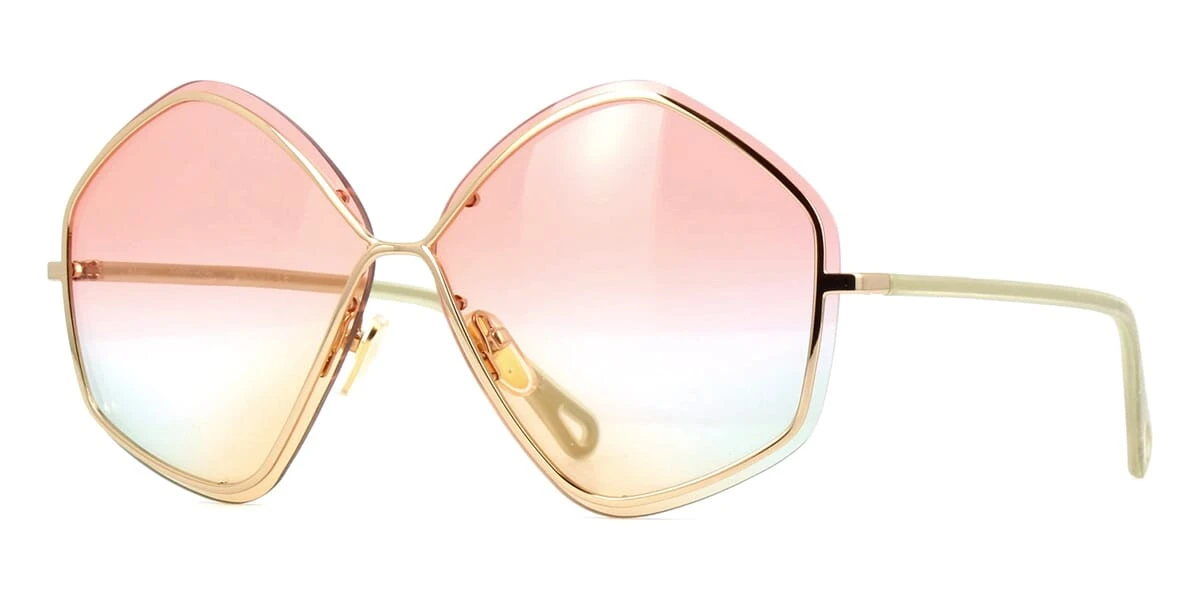 This round Chloe sunglass comes in a gold and matte green rubber frame with orange to blue brown gradient lenses.