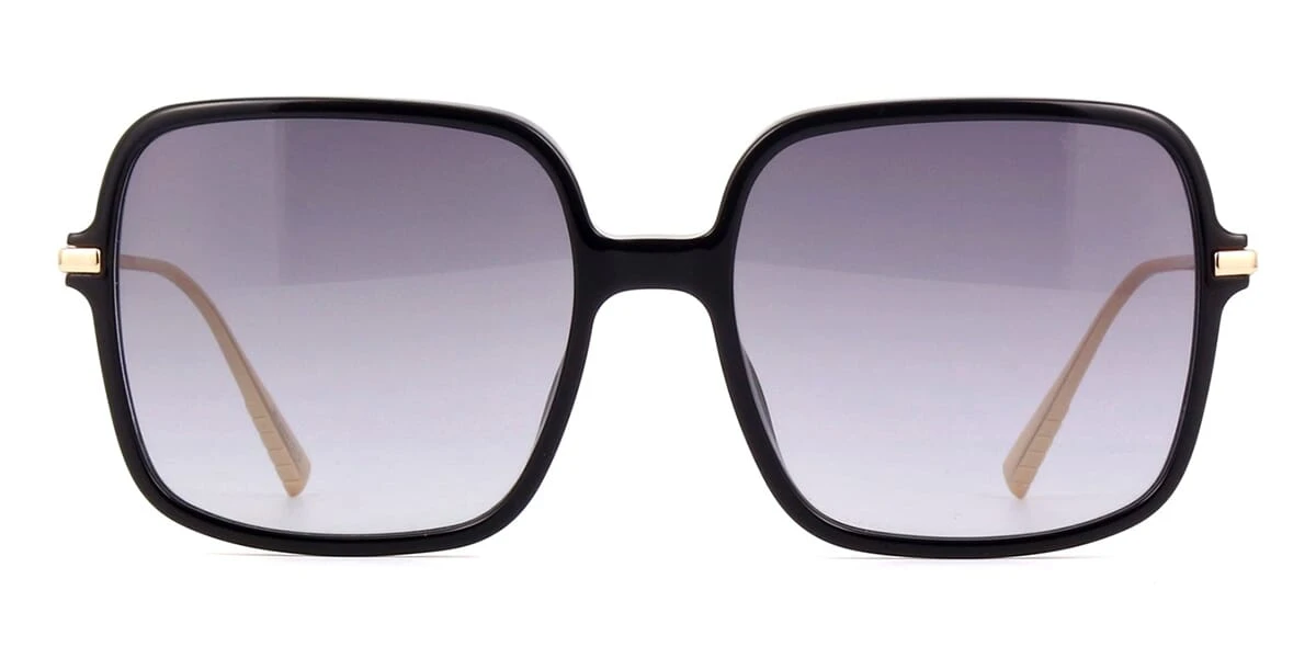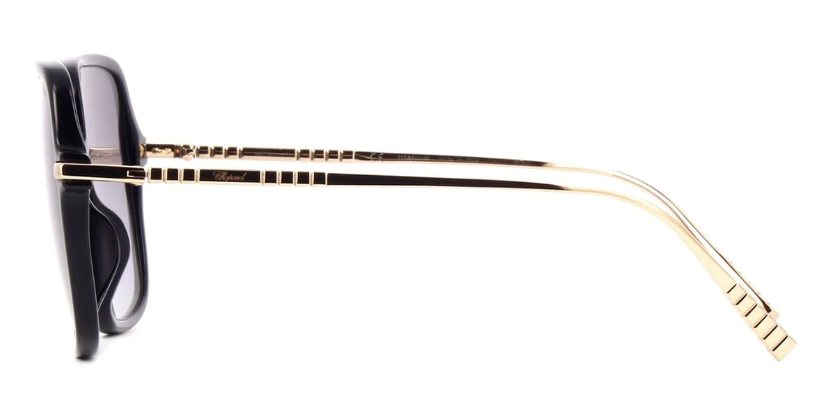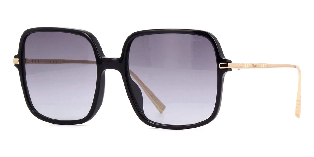 This square Chopard sunglass comes in a shiny black and gold frame with grey smoke gradient lenses.