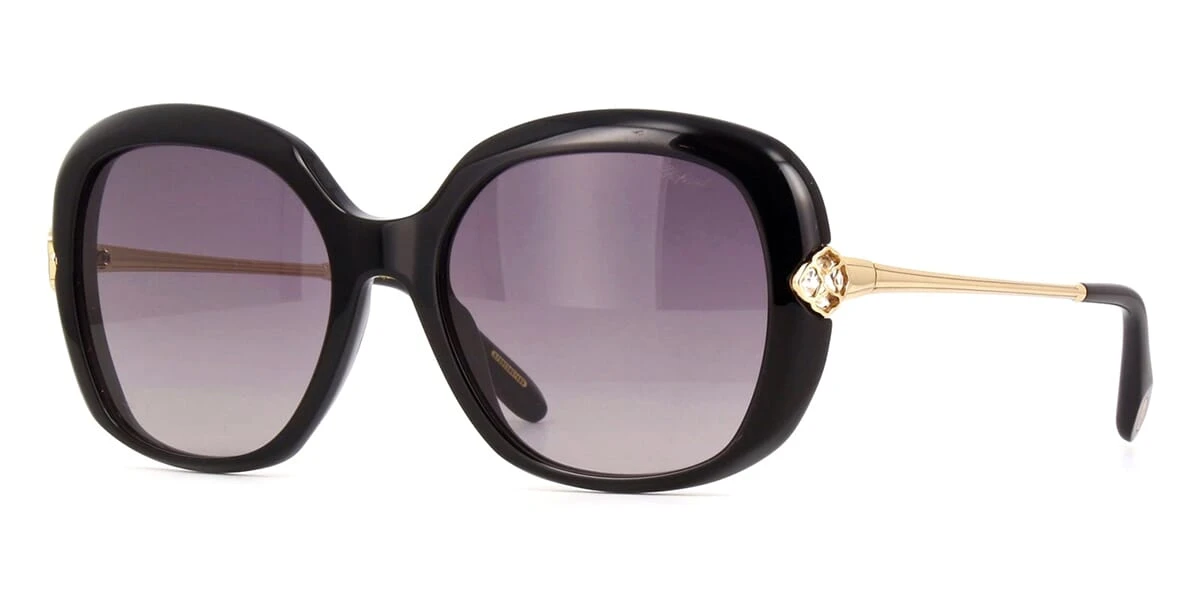 This square Chopard sunglass comes in a shiny black frame with grey lenses.