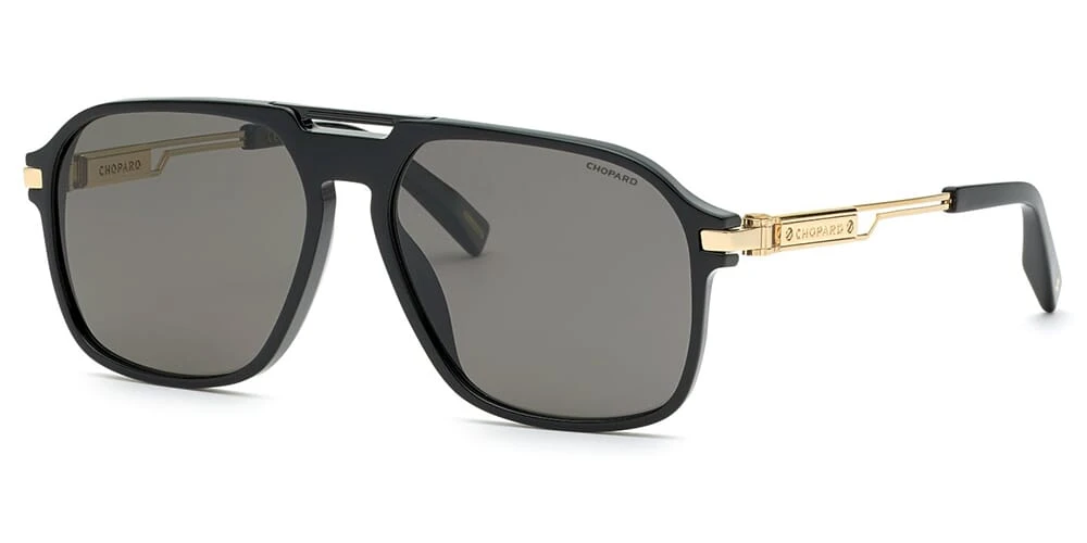 This aviator Chopard sunglass comes in a shiny black frame with smoke grey polarised lenses.