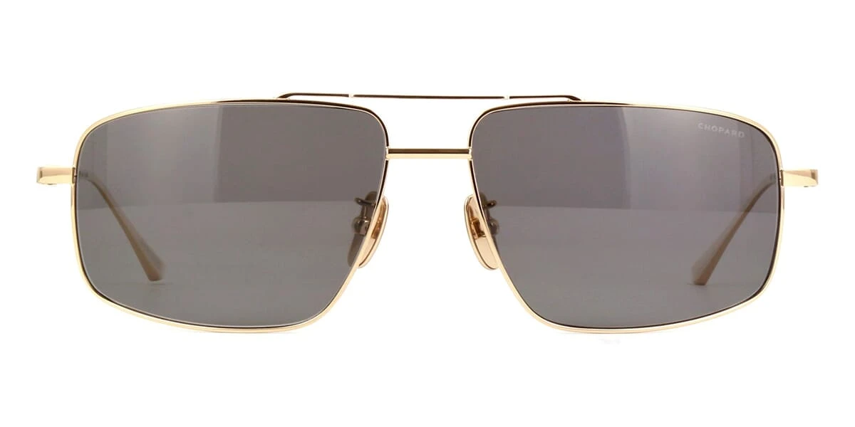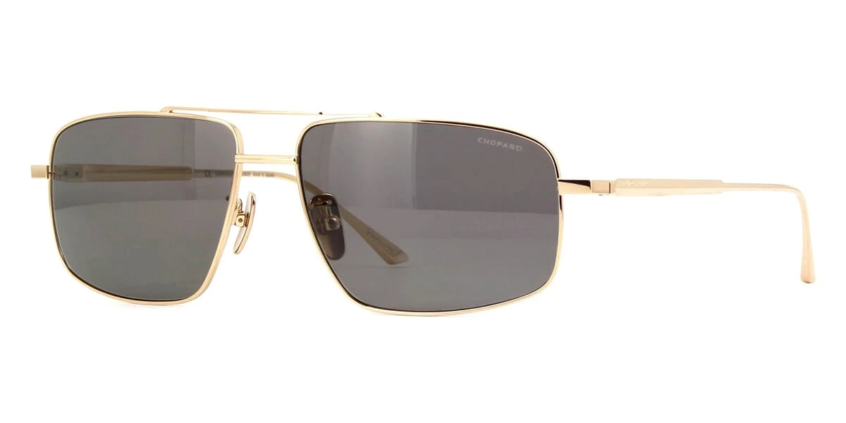 This square Chopard sunglass comes in a shiny rose gold frame with grey polarised lenses.