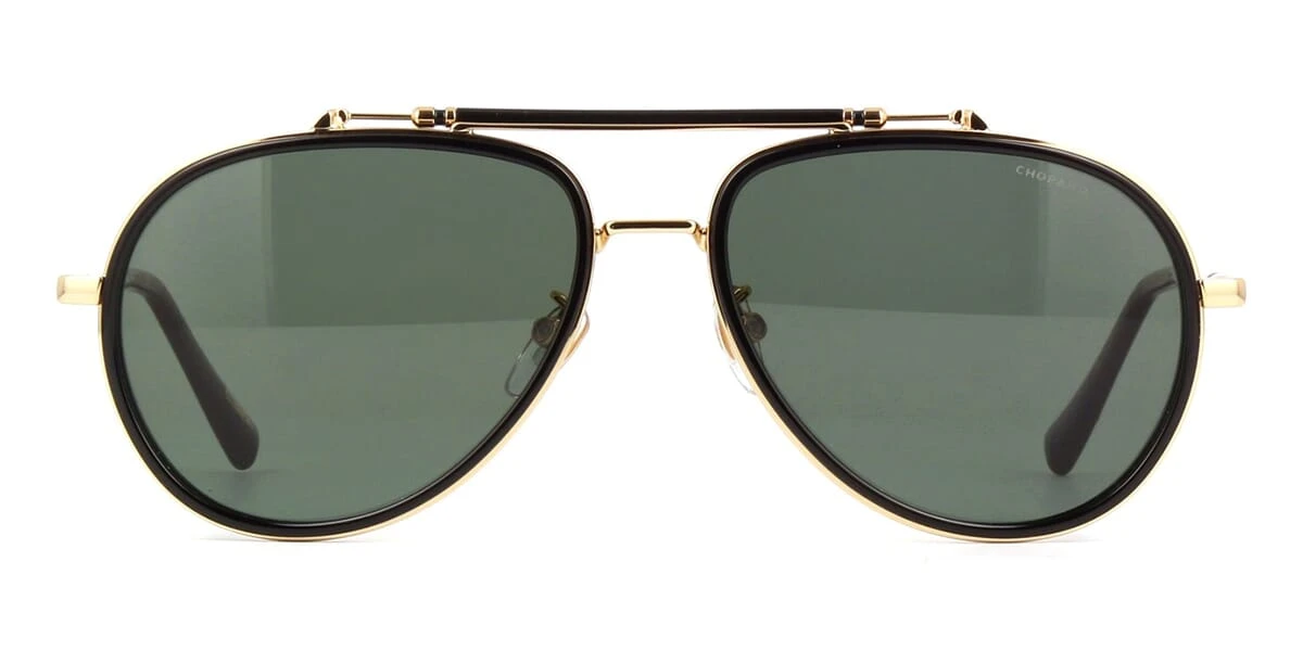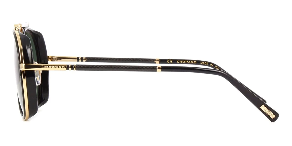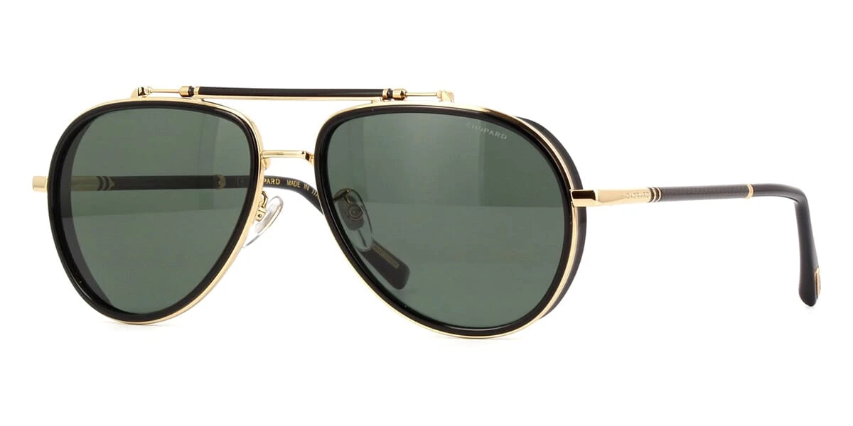 This aviator Chopard sunglass comes in a shiny black and gold with carbon frame with green polarised lenses.