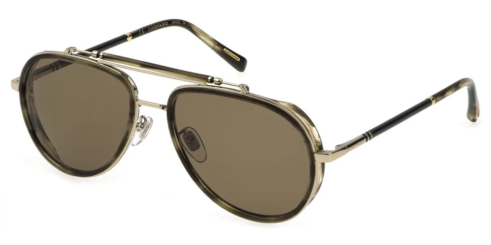 This aviator Chopard sunglass comes in a shiny brown striped havana frame with light brown polarised lenses.