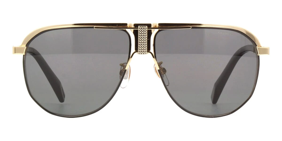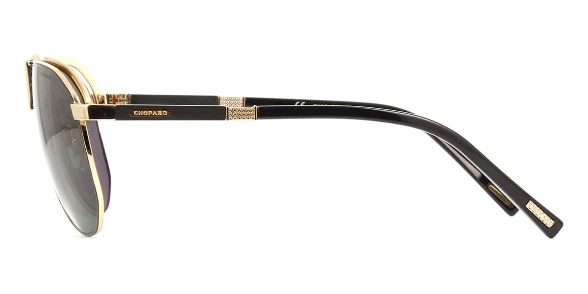 This aviator Chopard sunglass comes in a shiny rose gold with carbon fiber and balck frame with grey polarised lenses.