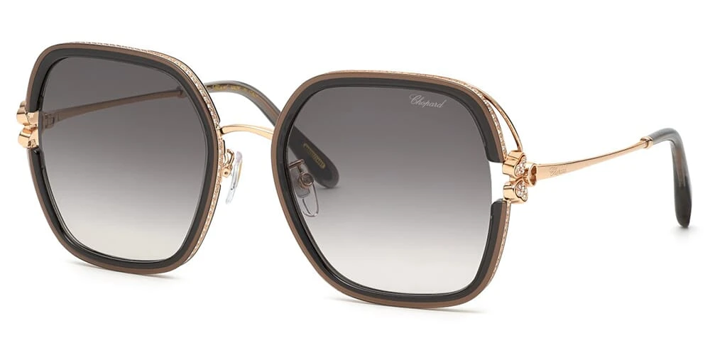 This square Chopard sunglass comes in a shiny black with gold frame with smoke gradient with light mirror lenses.