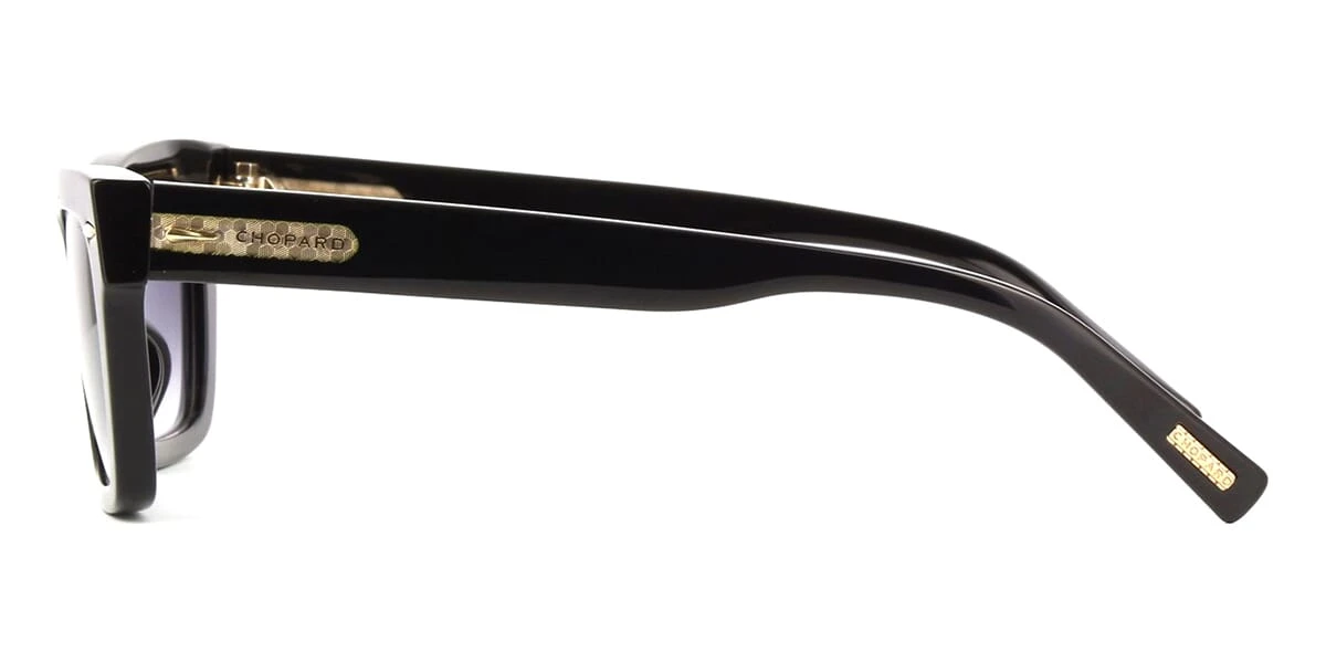This square Chopard sunglass comes in a shiny black with gold frame with grey gradient lenses.