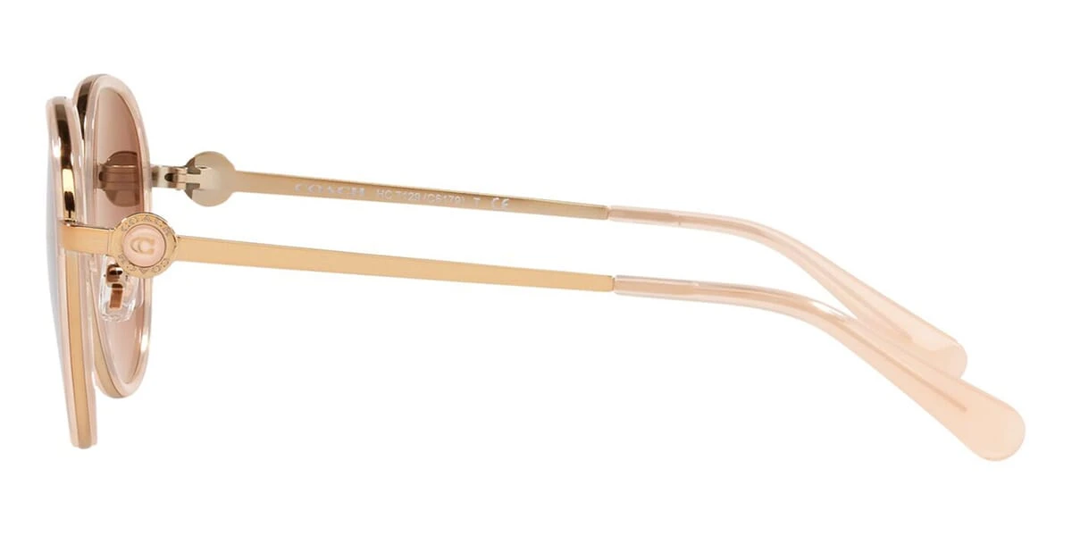 This round Coach sunglass comes in a milky pink frame with brown pink gradient lenses.
