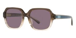 This rectangular Coach sunglass comes in a transparent brown gradient frame with violet lenses.
