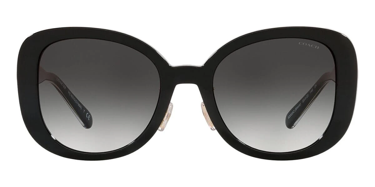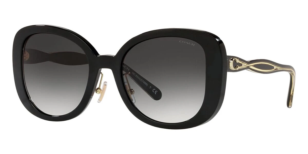 This square Coach sunglass comes in a black frame with grey gradient lenses.