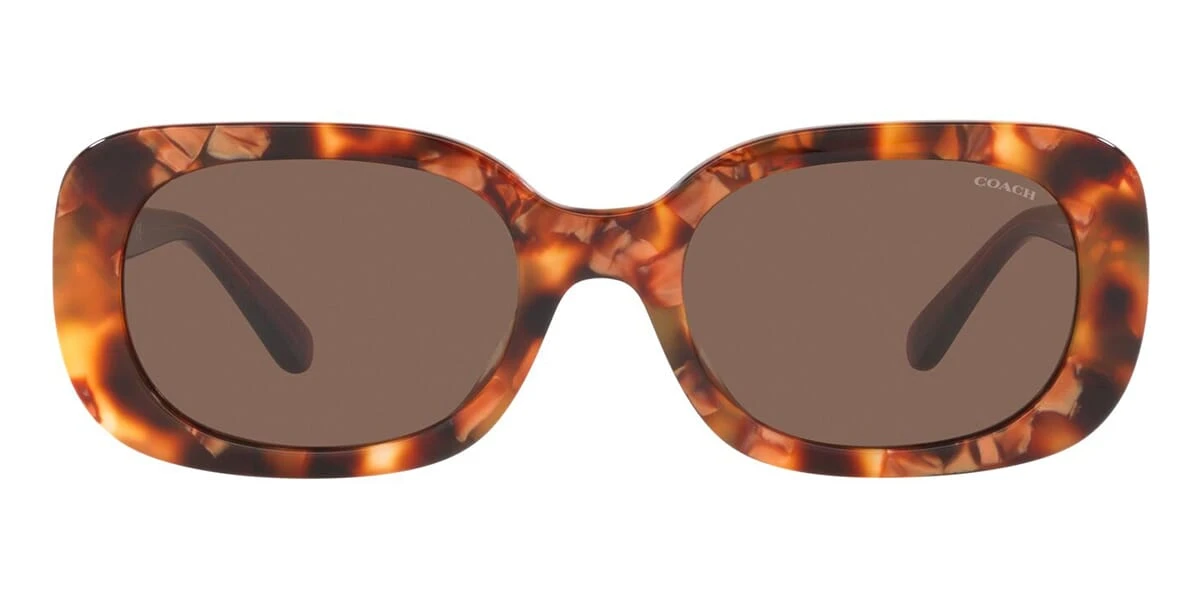 This round Coach sunglass comes in a pearlescent amber tortoise frame with brown solid lenses.