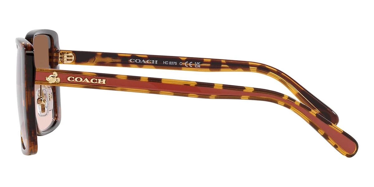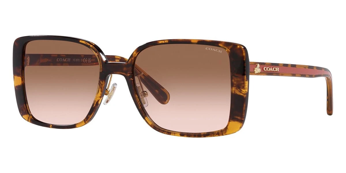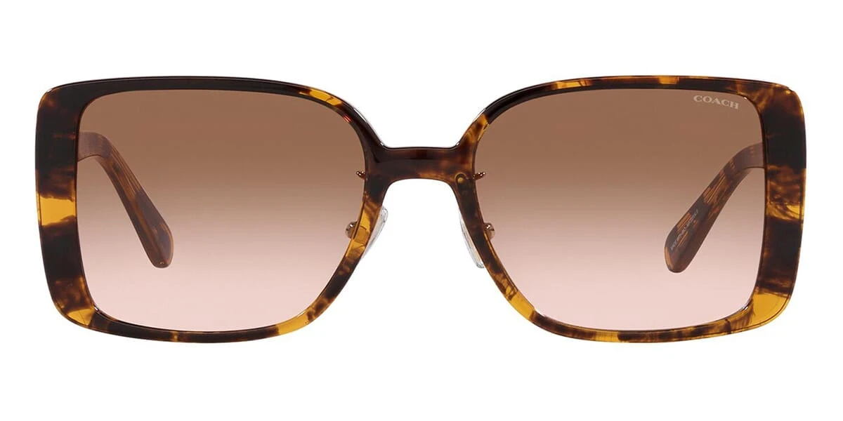 This square Coach sunglass comes in a dark tortoise frame with brown to pink gradient lenses.