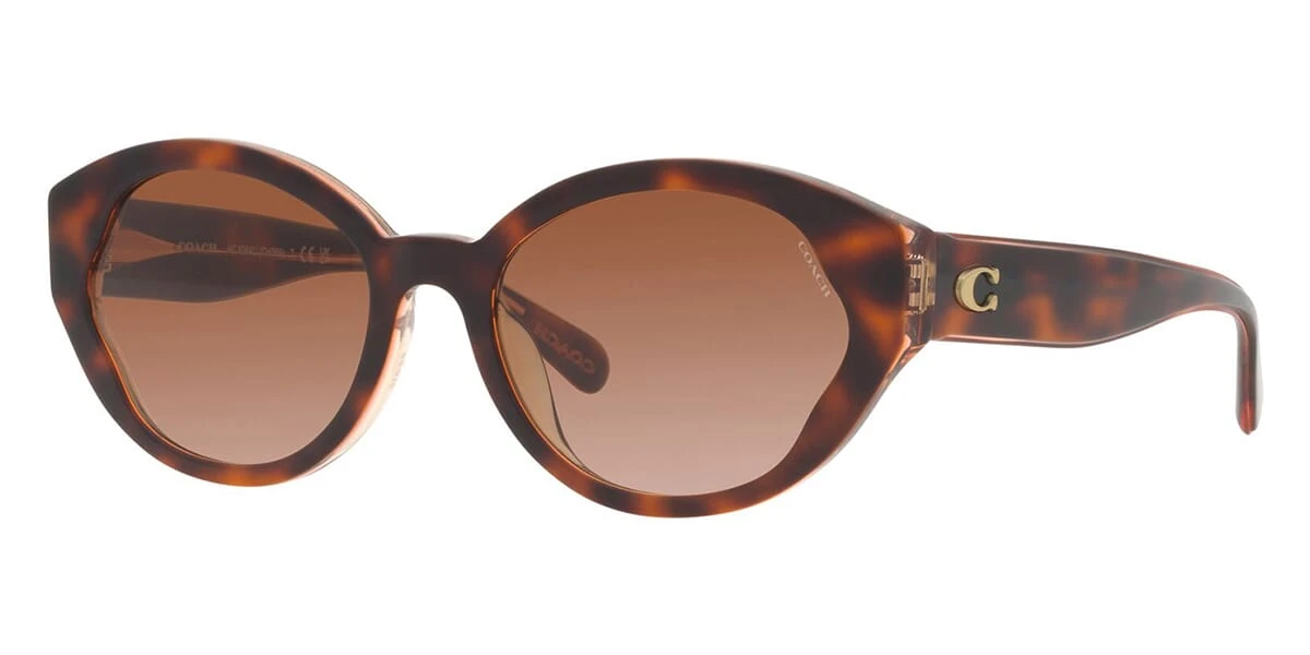 This round Coach sunglass comes in a tortoise and pink crystal frame with brown pink gradient lenses.