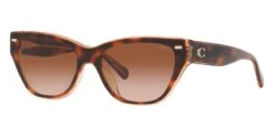 This cat eye Coach sunglass comes in a tortoise and pink crystal frame with brown pink gradient lenses.