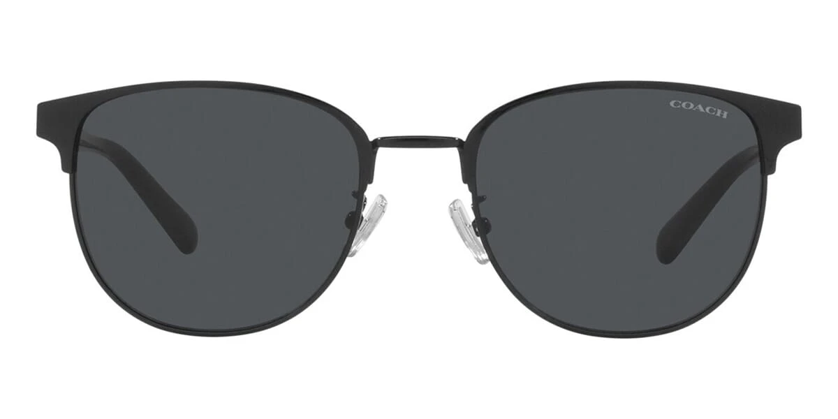 This round Coach sunglass comes in a shiny black frame with grey solid lenses.