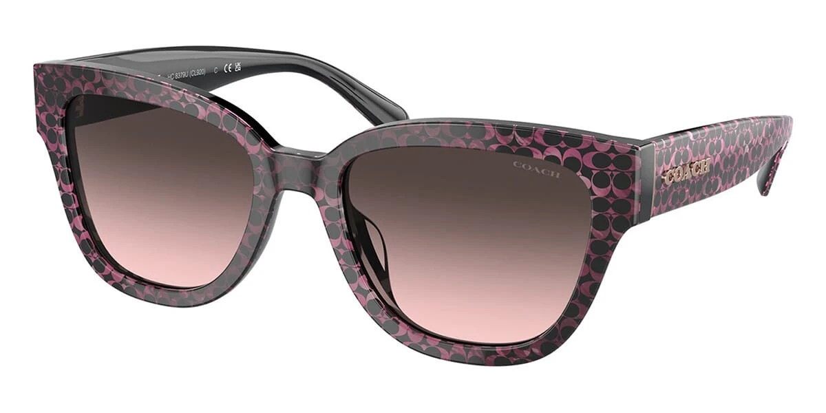 This butterfly Coach sunglass comes in a ruby pearl signature c frame with grey to rose gradient lenses.