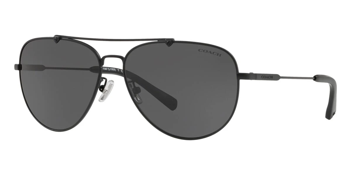 This aviator Coach sunglass comes in a matte black frame with dark grey lenses.