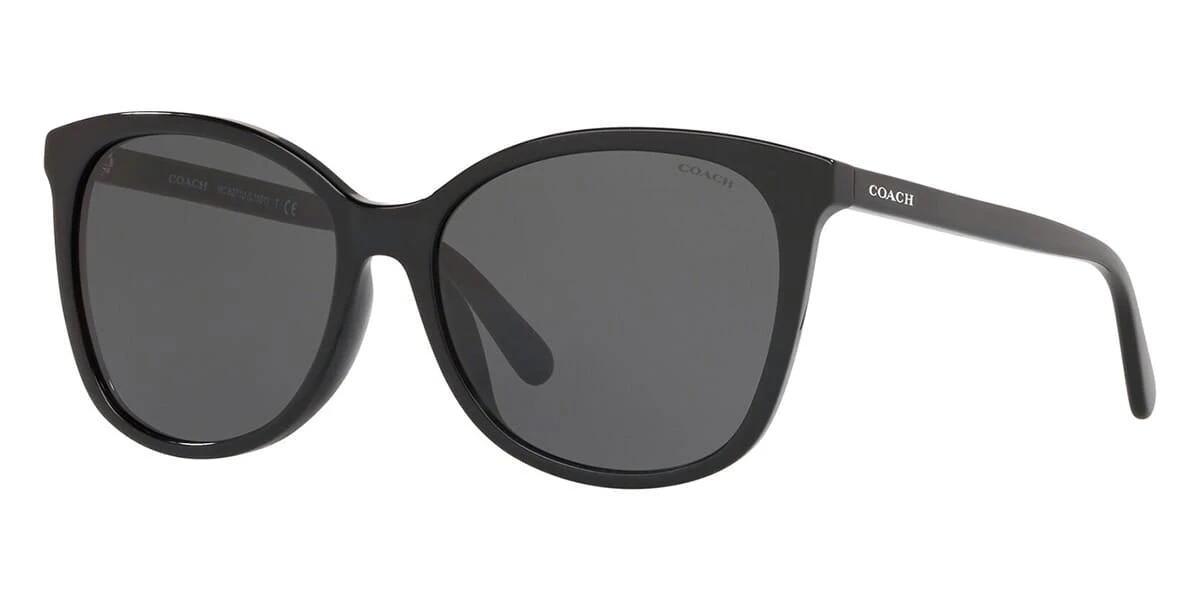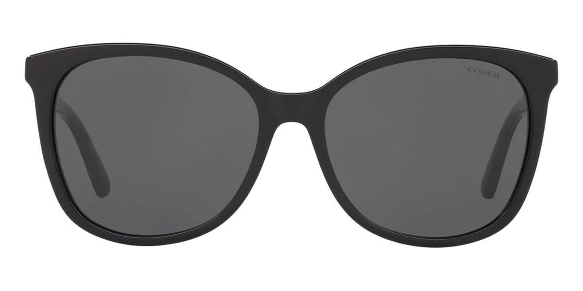 This square Coach sunglass comes in a black frame with dark grey lenses.