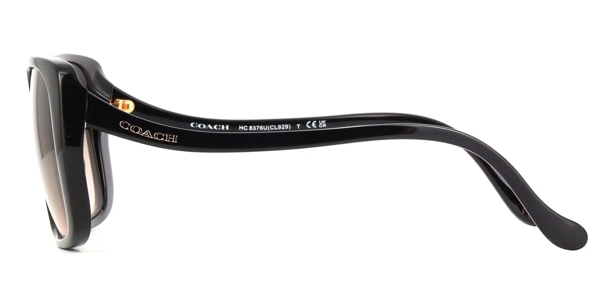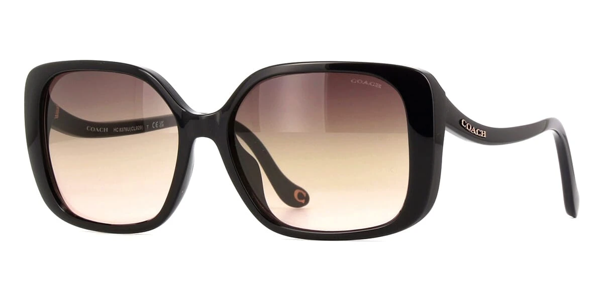 This square Coach sunglass comes in a shiny black frame with pink gradient lenses.
