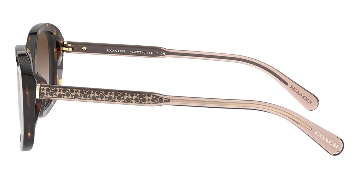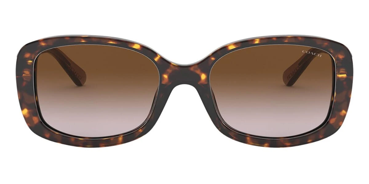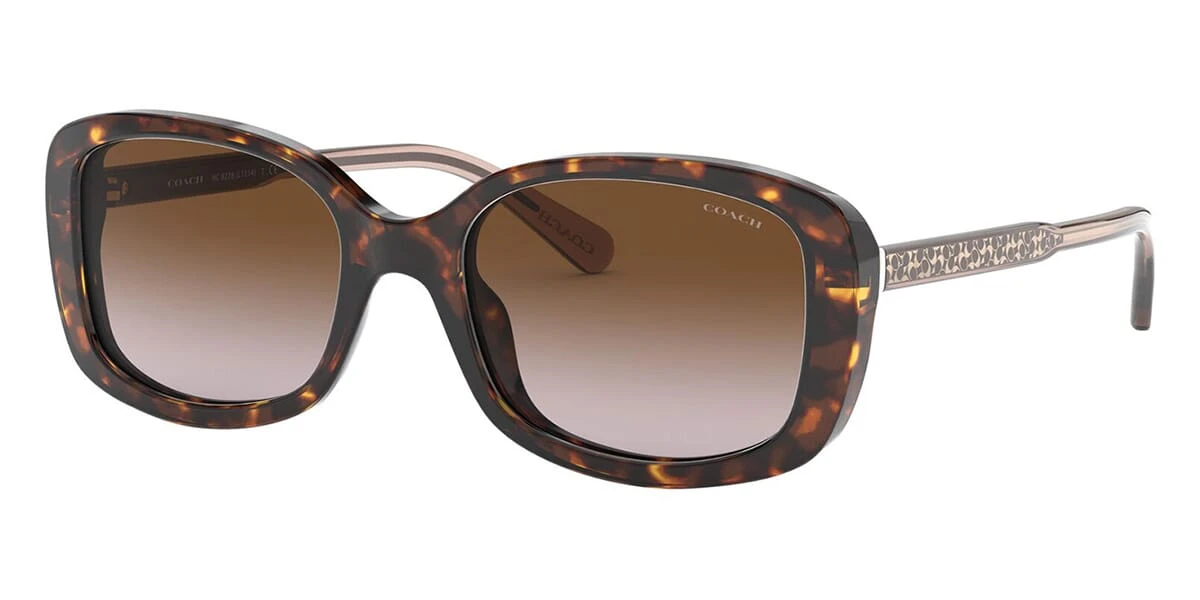 This rectangular Coach sunglass comes in a dark tortoise frame with brown gradient lenses.