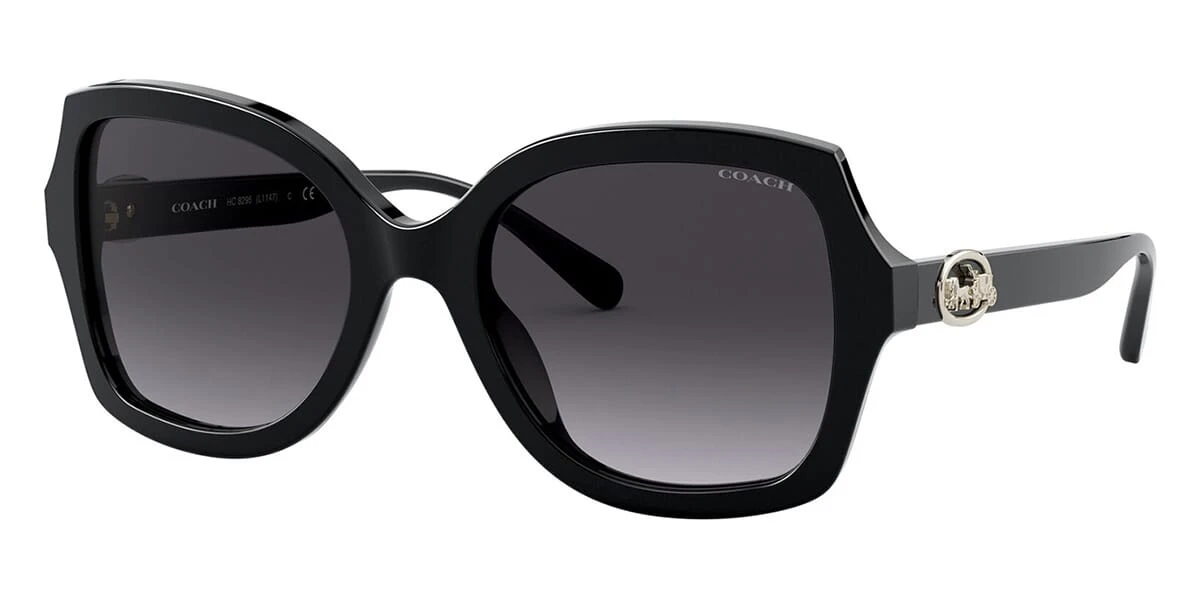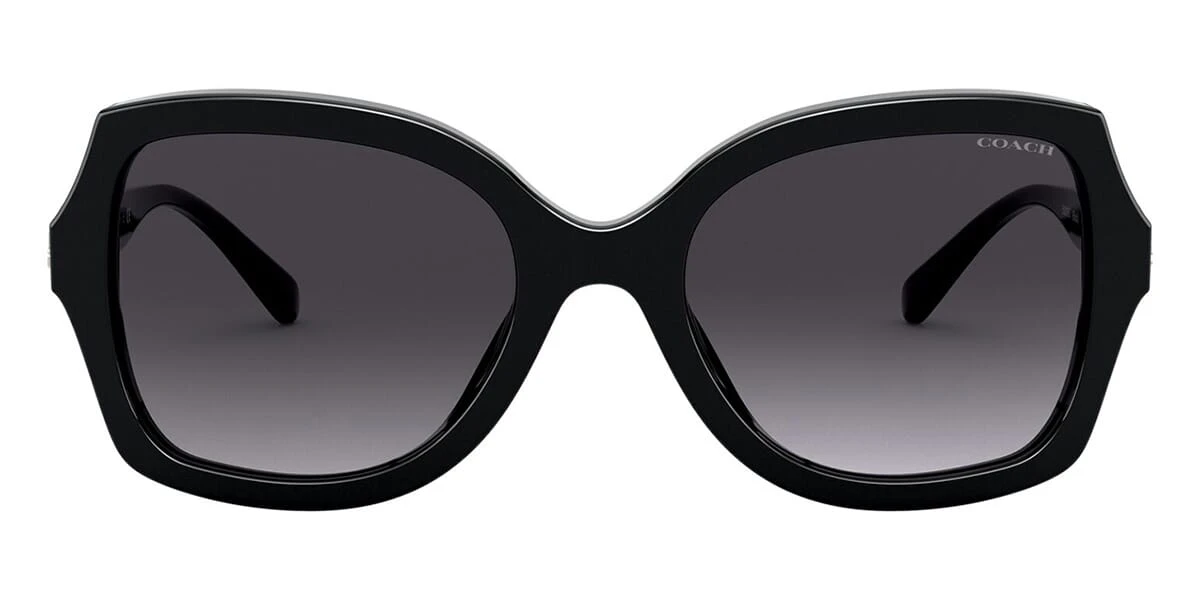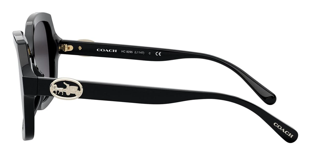 This square Coach sunglass comes in a black frame with dark gray gradient lenses.