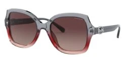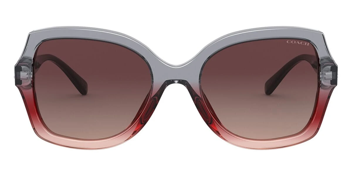 This square Coach sunglass comes in a grey burgundy gradient frame with burgundy gray gradient lenses.