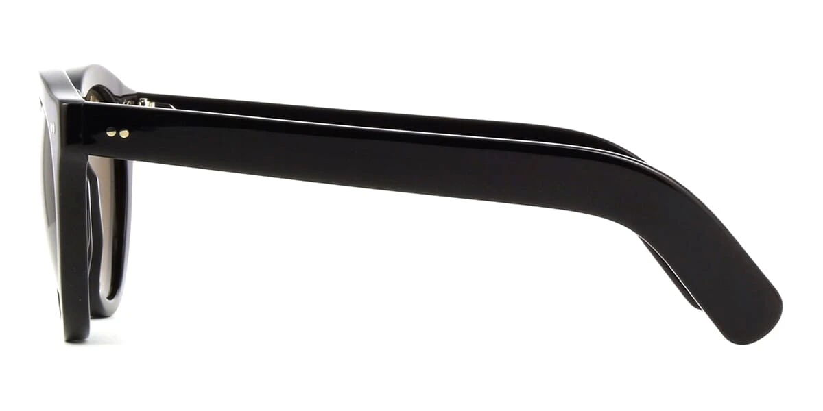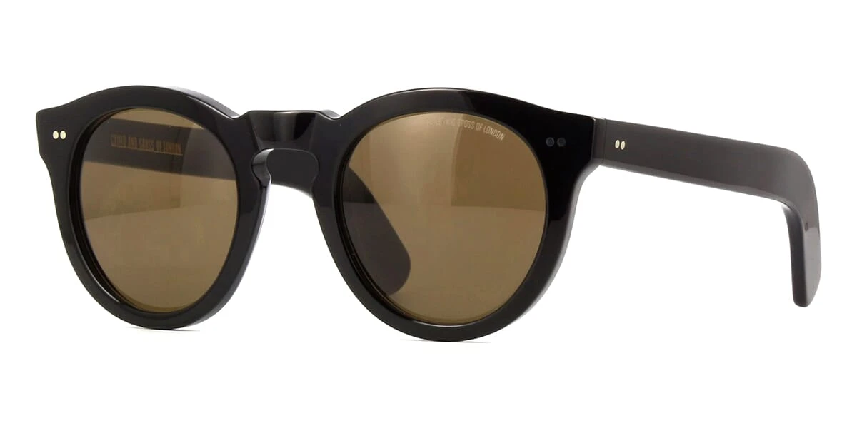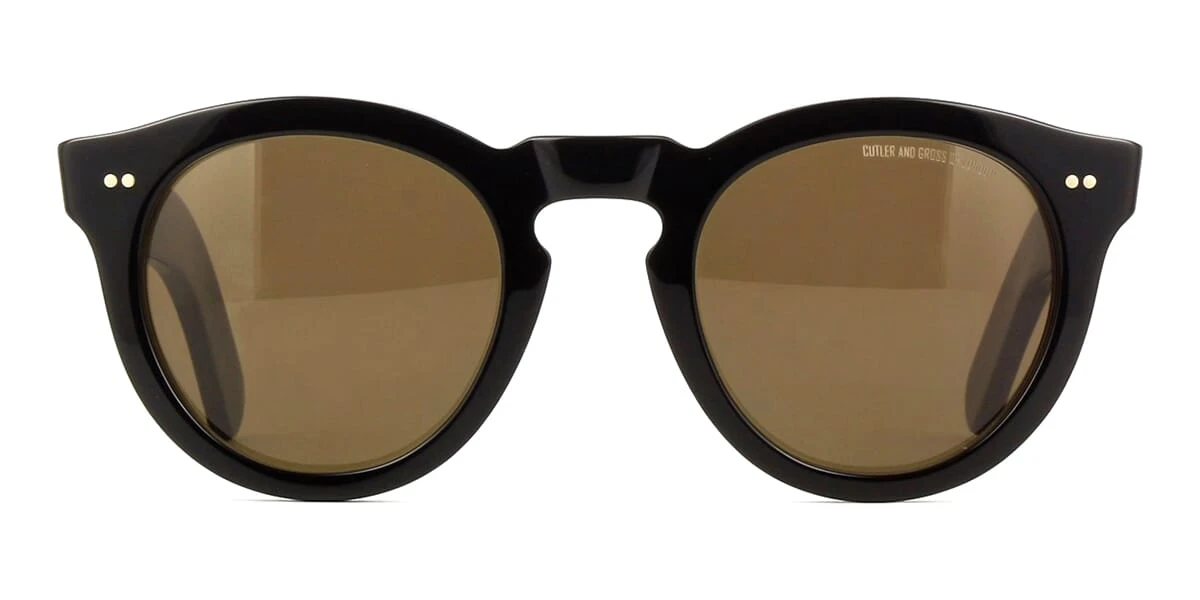 This round Cutler and Gross sunglass comes in a shiny black frame with brown lenses.