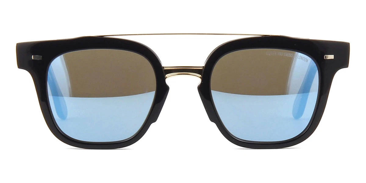 This square Cutler and Gross sunglass comes in a black and gold frame with brown with blue mirror lenses.