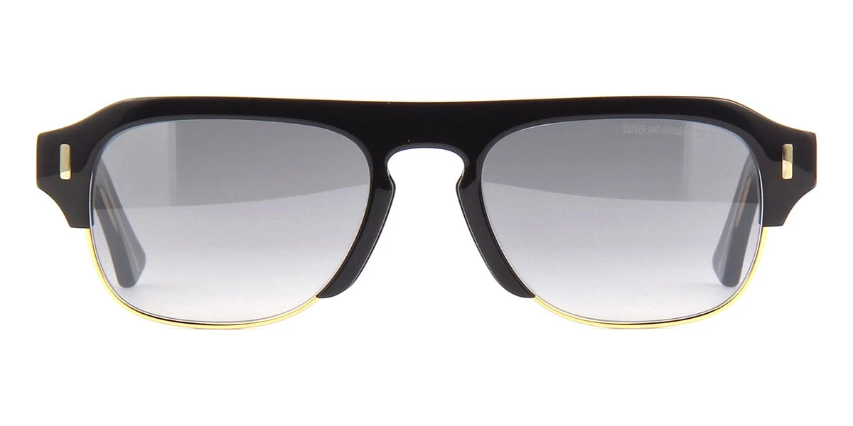 This round Cutler and Gross sunglass comes in a black and gold frame with grey gradient lenses.