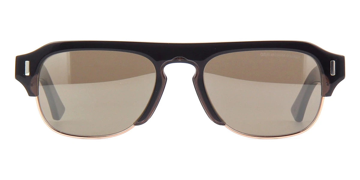 This square Cutler and Gross sunglass comes in a godfather grey and copper frame with brown with silver mirror lenses.