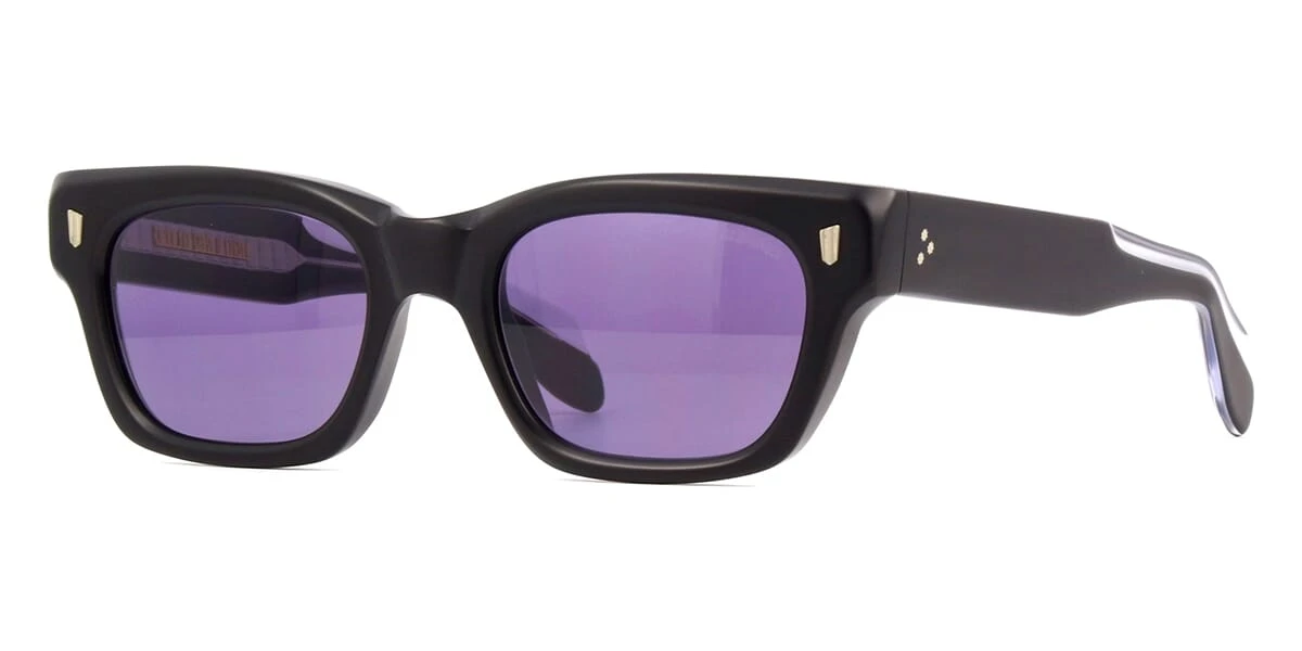 This square Cutler and Gross sunglass comes in a matte black frame with violet lenses.