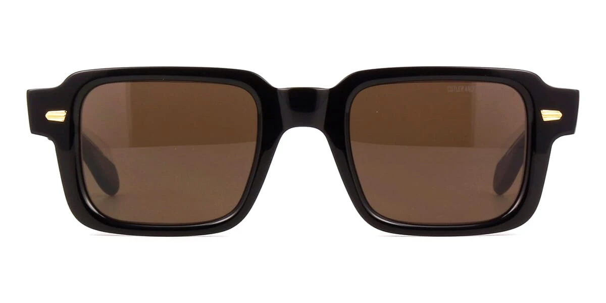 This square Cutler and Gross sunglass comes in a shiny black frame with brown lenses.