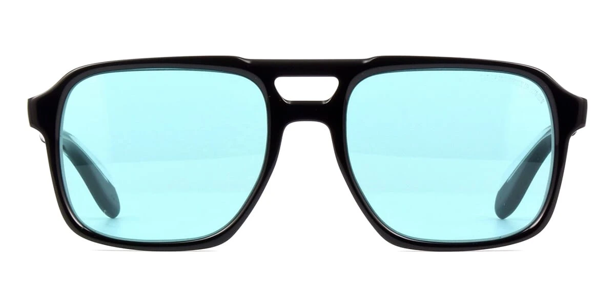 This square Cutler and Gross sunglass comes in a black frame with light blue lenses.