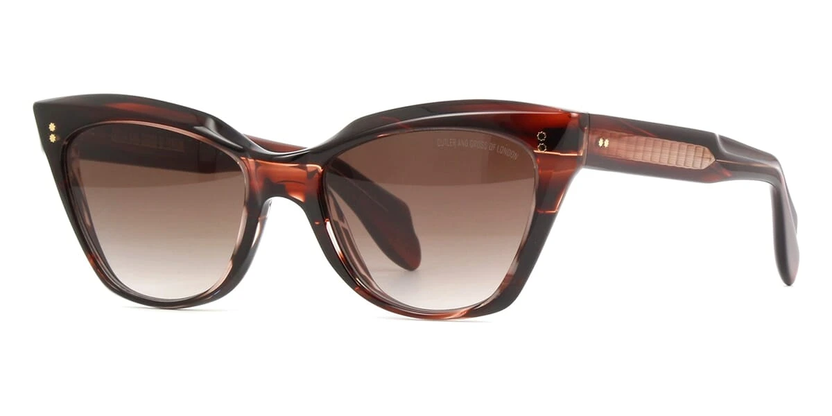 This cat eye Cutler and Gross sunglass comes in a striped brown havana frame with brown gradient lenses.