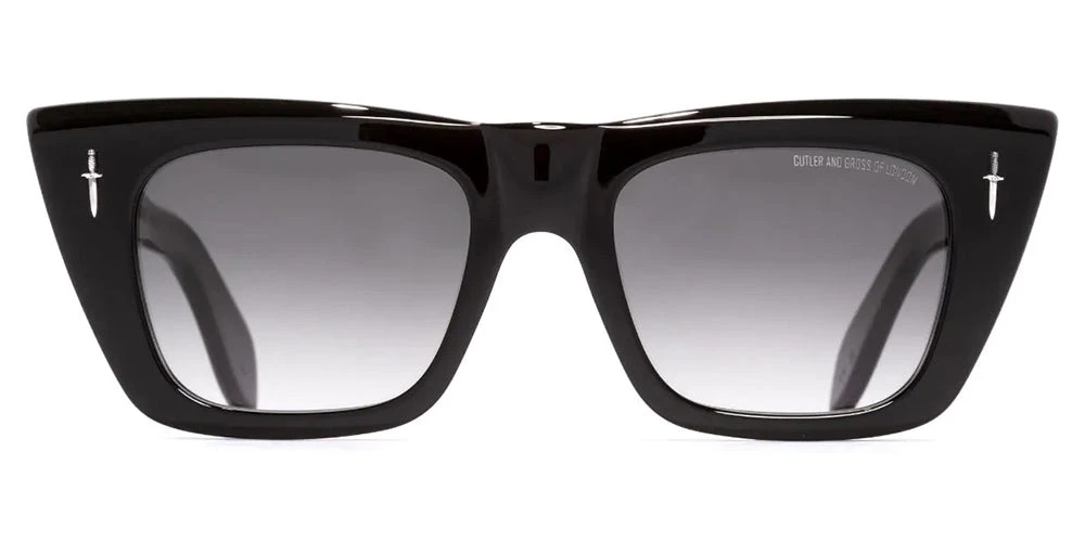 This square Cutler and Gross sunglass comes in a black with silver frame with grey gradient lenses.