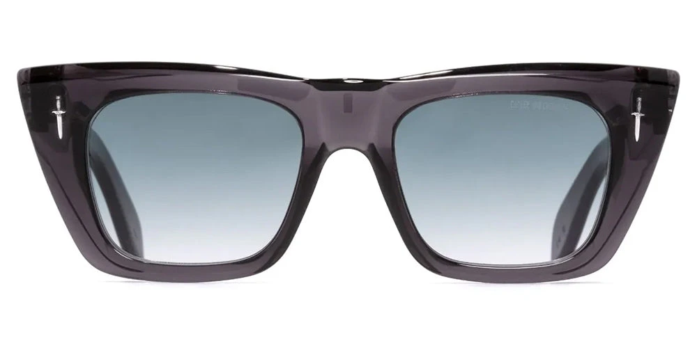 This square Cutler and Gross sunglass comes in a dark grey with silver frame with blue gradient lenses.