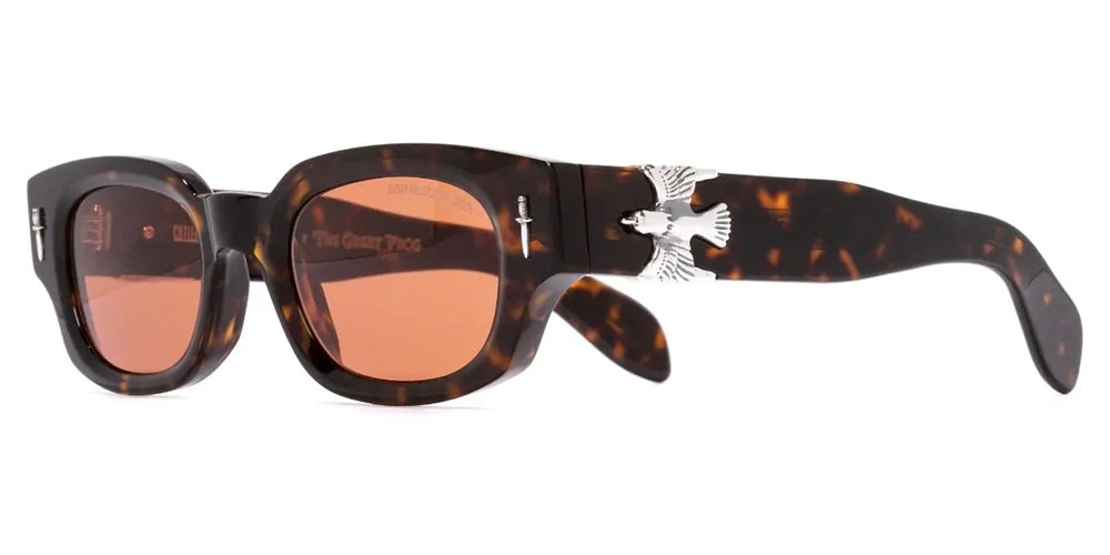 This square Cutler and Gross sunglass comes in a brown havana with silver frame with orange lenses.