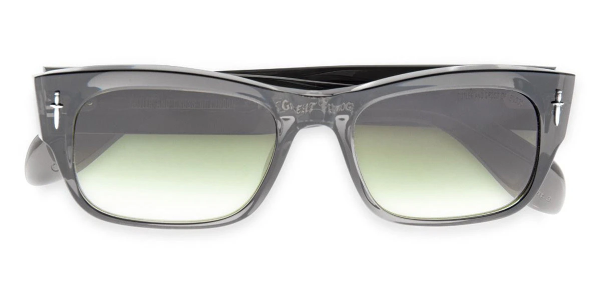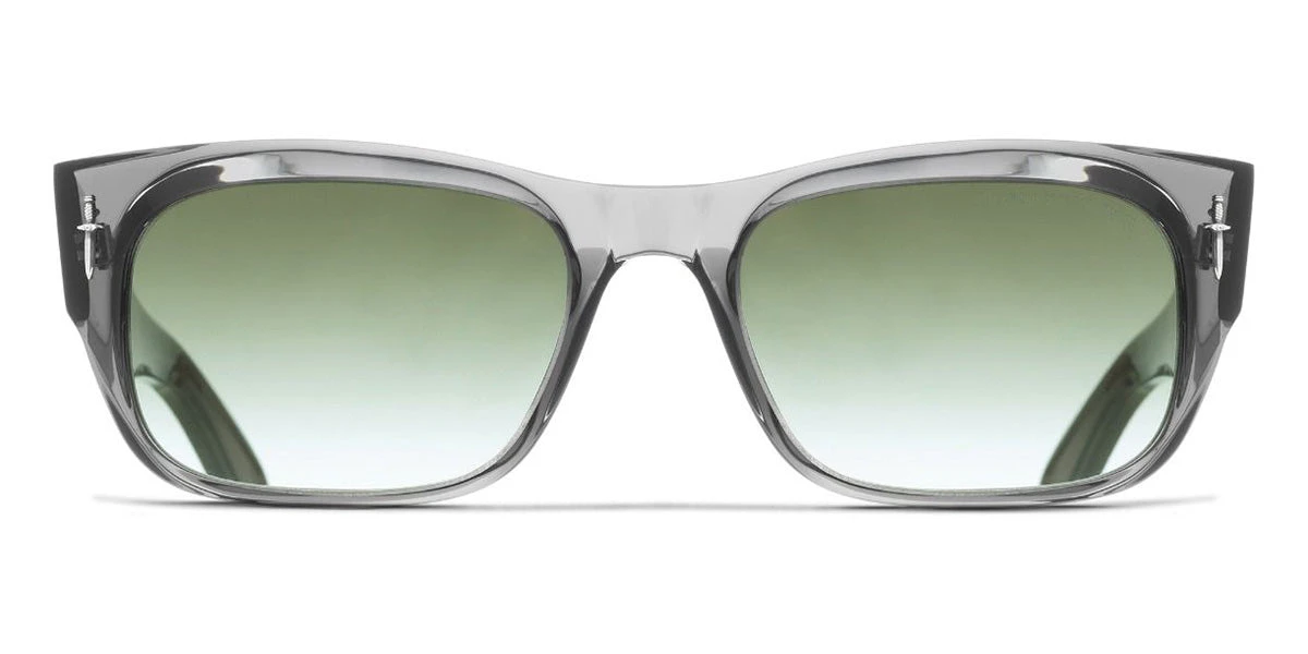 This square Cutler and Gross sunglass comes in a pewter grey with 925 sterling silver dagger frame with green gradient lenses.