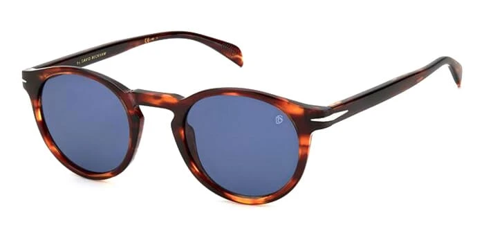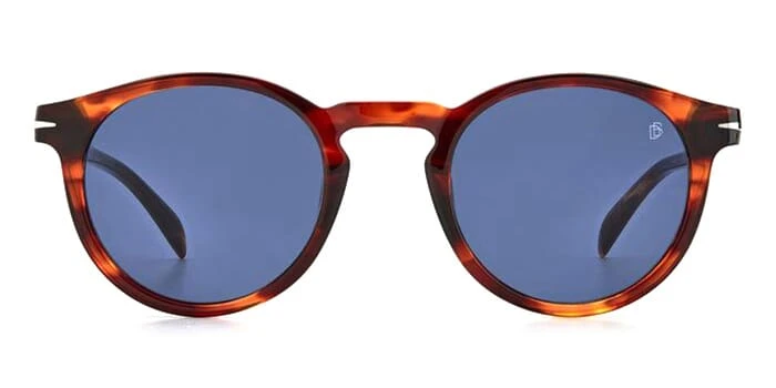 This round David Beckham sunglass comes in a red and havana frame with blue lenses.