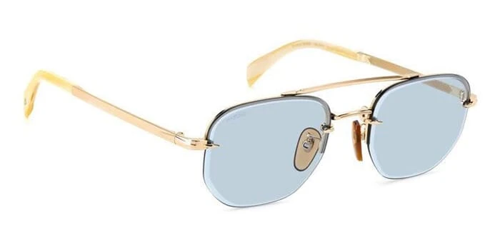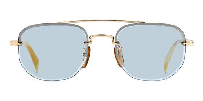 This square David Beckham sunglass comes in a gold and beige horn frame with blue lenses.
