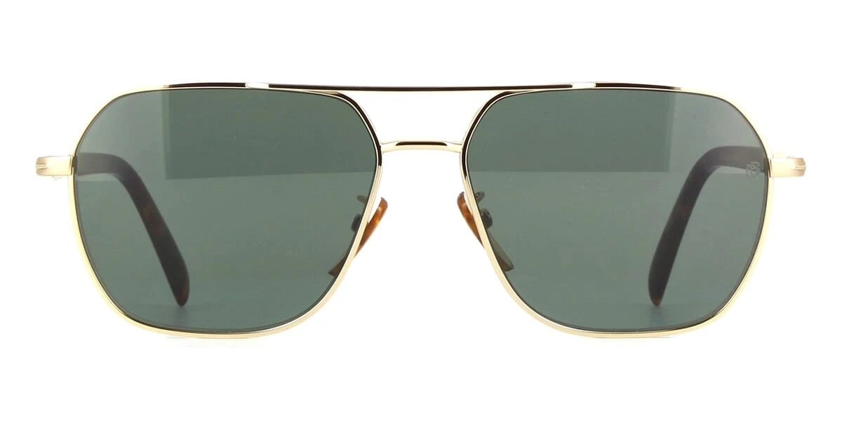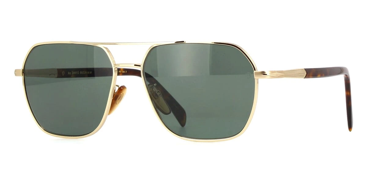 This square David Beckham sunglass comes in a shiny gold with havana frame with dark green with light mirror lenses.