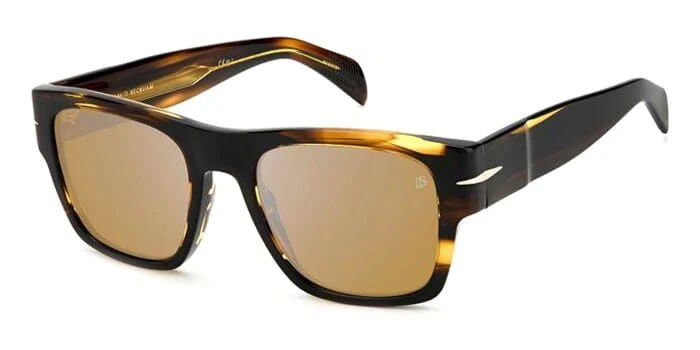 This square David Beckham sunglass comes in a striped brown frame with brown lenses.