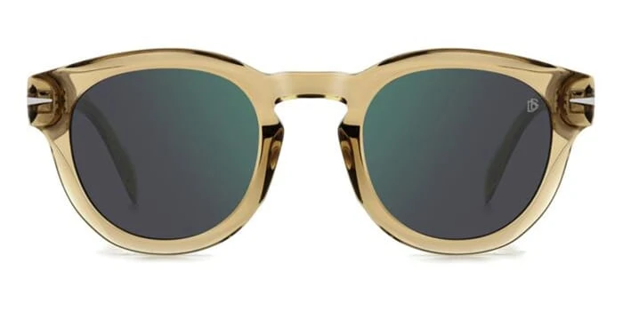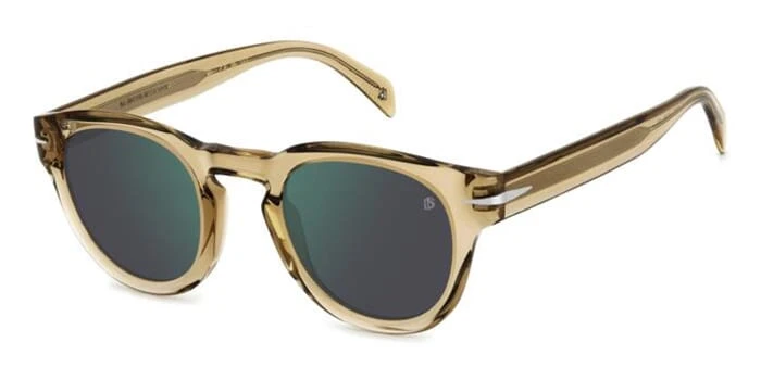 This square David Beckham sunglass comes in a ochre frame with grey with green flash mirror lenses.