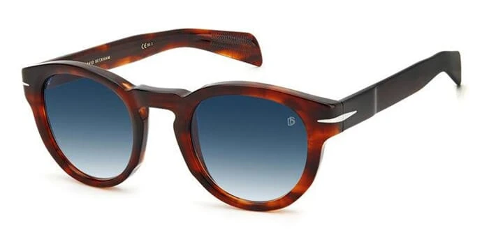 This round David Beckham sunglass comes in a brown with striped havana frame with blue gradient lenses.